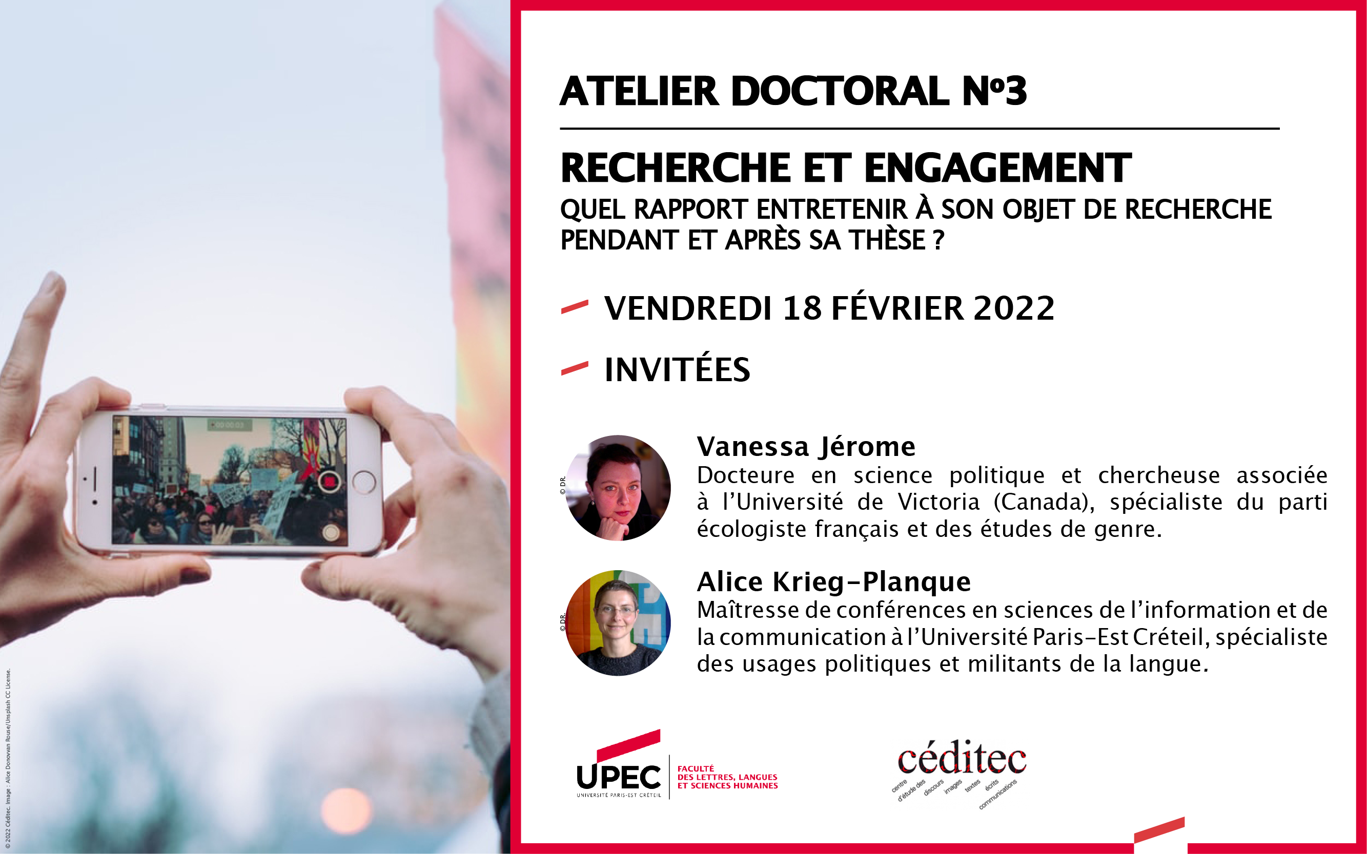 Qu’entend-on alors par « engagement » dans et par la recherche ? Comment étudier un objet de recherche dont on est à la fois partie prenante et observateur·rice ? Quelles ressources peut constituer « l'engagement » et quelles en sont les limites ? Y a-t-il des « précautions » à prendre en amont de la recherche et après (voire pendant) et si oui, quelles seraient-elles ? Pour tenter de répondre à ces questions, les doctorant·e·s du Céditec organisent un atelier interne sur cette thématique. Après avoir introduit la notion d’engagement à l’appui de plusieurs travaux de référence, nous aurons le plaisir de recevoir et d’écouter le témoignage de deux chercheuses pour qui la question de l’engagement s’est posée dans la conduite ou dans la restitution de leurs travaux. Chercheuse associée à l’Université de Victoria (Canada), Vanessa Jérome est spécialiste du parti écologiste français sur lequel porte sa thèse récemment publiée dans un ouvrage intitulé Militer chez les Verts (Presses de SciencesPo, 2021). Maîtresse de conférences en sciences de l’information et de la communication à l’Université Paris-Est Créteil et chercheuse au Céditec, Alice Krieg-Planque est spécialiste de l’analyse des discours politiques et institutionnels. Elle est notamment l’autrice de l’ouvrage « Purification ethnique ». Une formule et son histoire (CNRS, 2003) tiré de sa thèse. Ses travaux récents interrogent les usages politiques et militants de la langue.